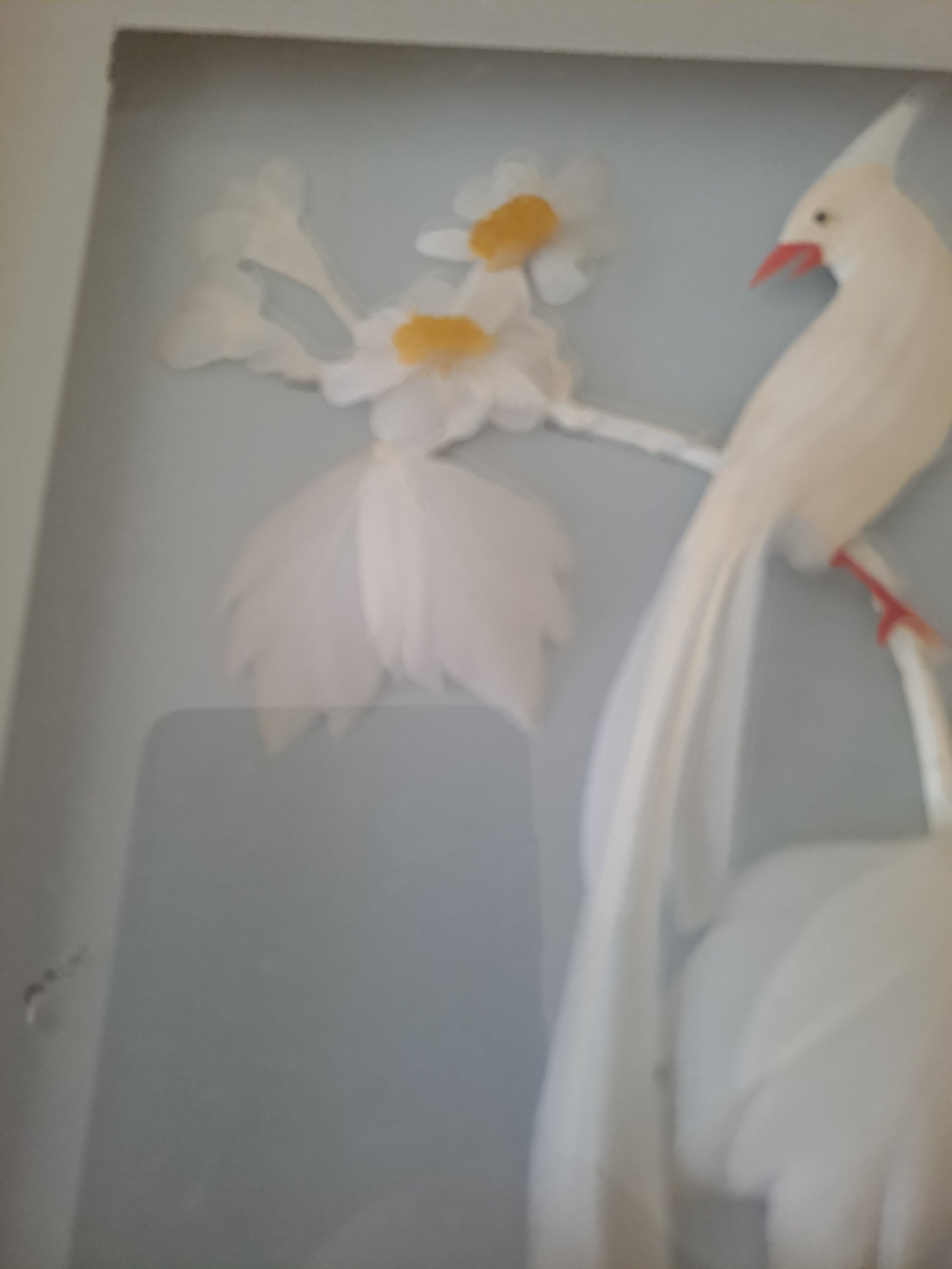 Cadre Représentant un oiseau blanc fabriqué avec de véritables plumes.
