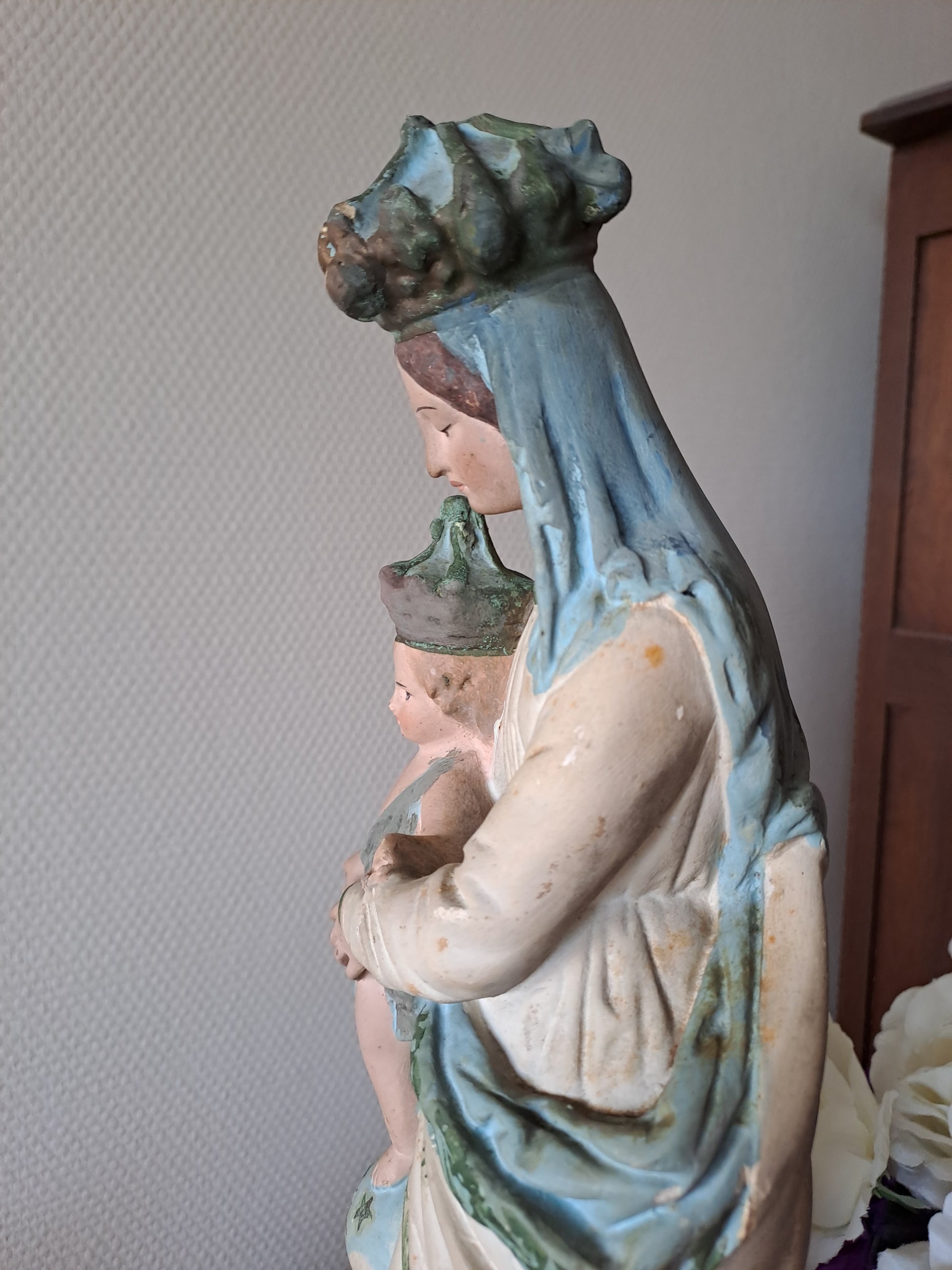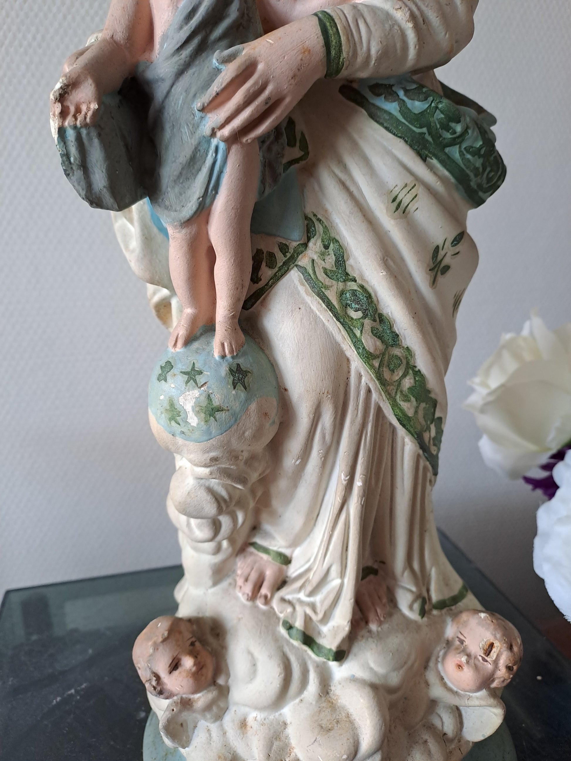 Note: quelques manques, notamment au niveau des doigts de l'enfant Jésus et de la couronne, quelques éclats, visibles sur les photos.